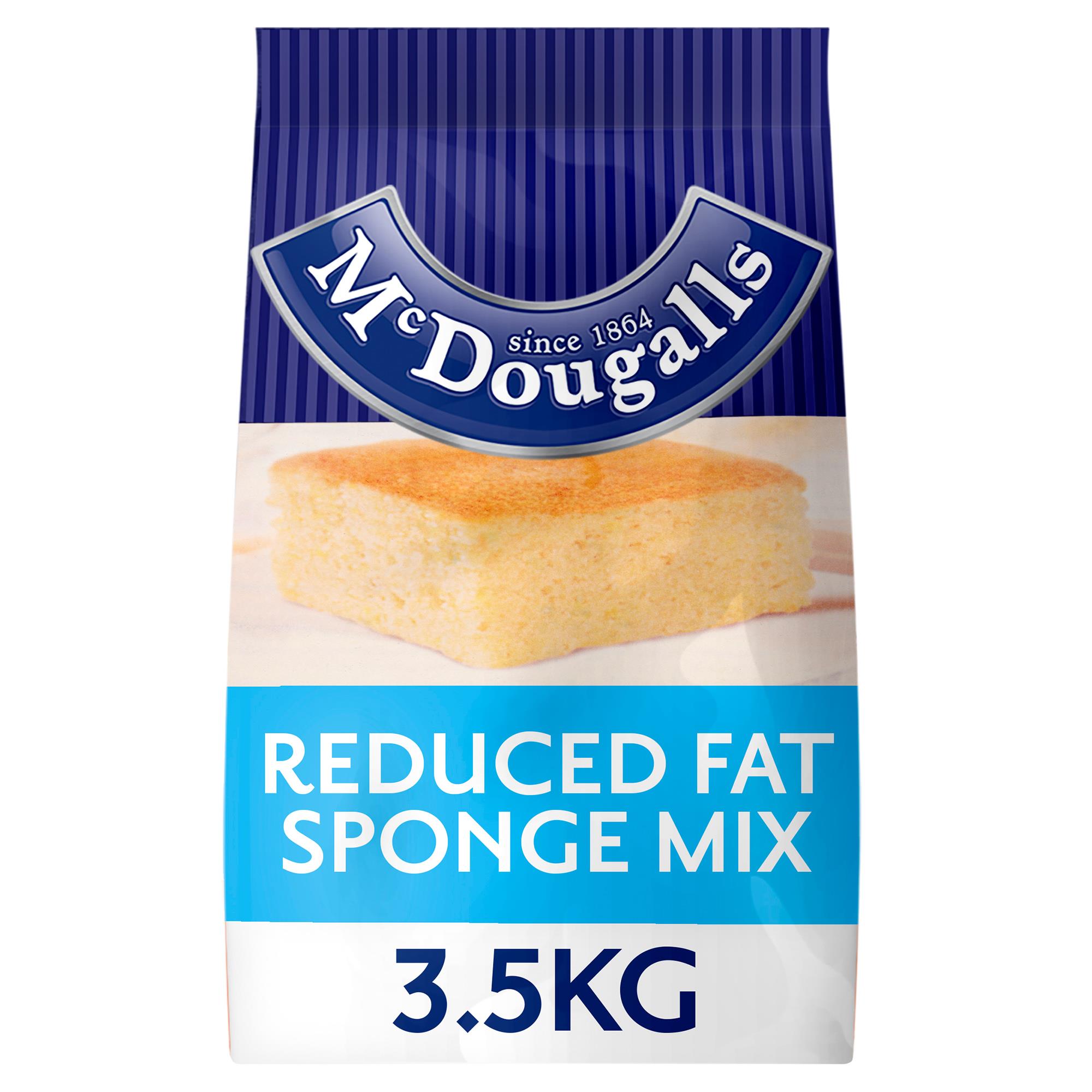 Yield GuideDry mix Approx water Approx portions 60g (2 oz)1kg500ml 24Whole Bag 3.5kg1.75L 871lb8 fl oz 12Whole Bag 7lb 11oz 3 pts 2fl oz87Make-Up Instructions1.Add the correct amount of cold water to the mixing bowl and add the weighed out McDougalls Reduced Fat* Sponge Mix, select the whisk mixing attachment.2.Mix on SLOW speed for 1 minute. Scrape down. Mix for a further 4 minutes on MEDIUM speed.3.Use batter as required. Pour into a greased and lined 25cm x 35cm (10” x 14”) baking tin. Bake in a preheated oven at 190°C/375°F/Gas Mark 5 for 25-35 minutes until risen, golden and firm to the touch. For fan-assisted ovens, cook at 170°C/325°F/Gas Mark 3.