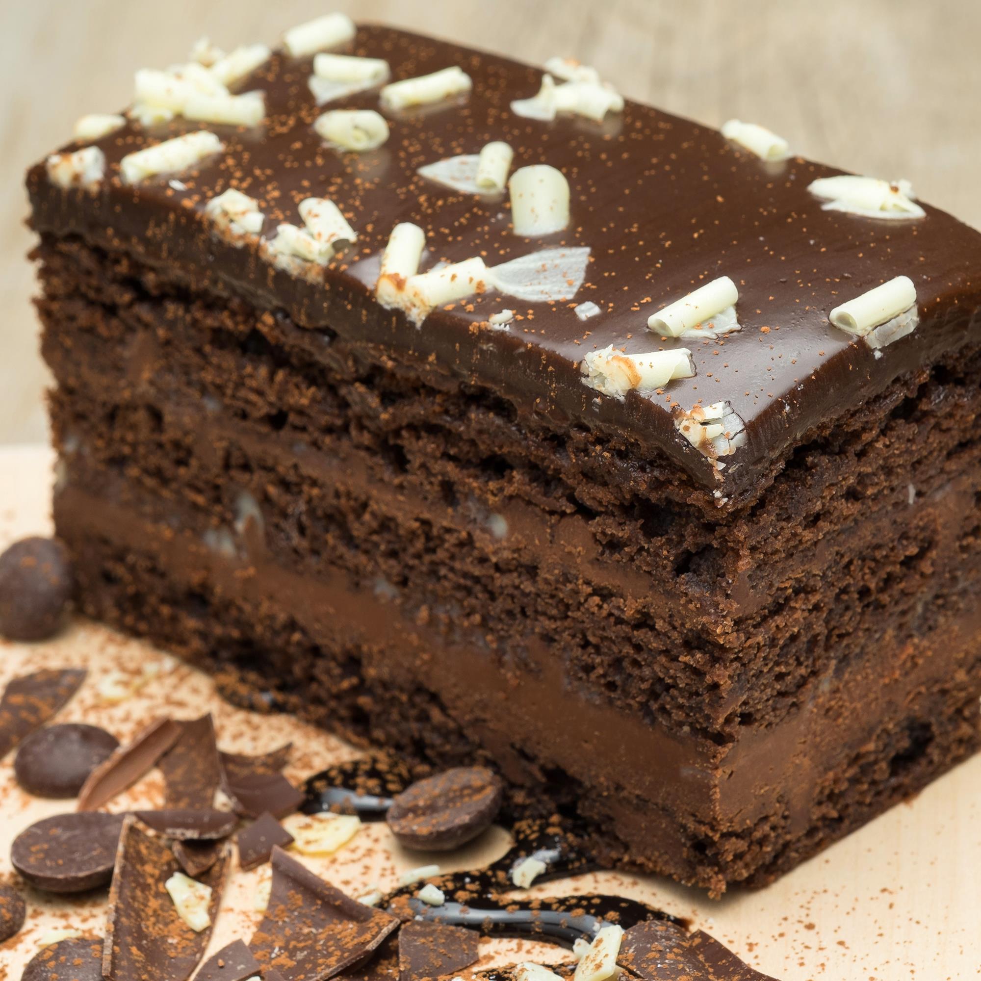 Light chocolate sponge sandwiched between rich dark and white chocolate ganache, topped with more dark ganache and white chocolate shavings.